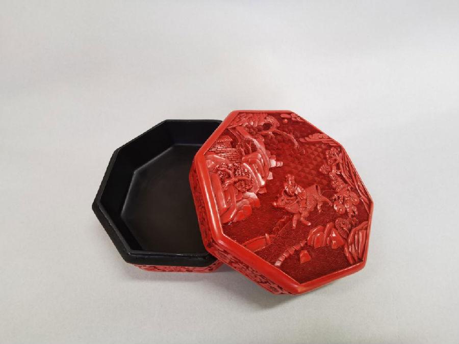 以北京艺术博物馆藏明代老子骑牛图八方形剔红盘为创意来源。采用传统雕漆工艺制作,取原器物中心图案,表现老子骑牛西出函谷关的故事。构图细密,锦地上雕刻亭阁、松枫、山石、云月,层次分明。造型古朴典雅,图案精美、色泽光润。