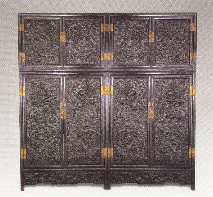橱柜主要是收藏衣物、置放食品等物的家具。橱的体型与桌子相仿,但以前所用的闷仓,多以门来代替。清式家具中的柜子,一般体型高大,可以存放大件的衣物和物品。对开门,柜内装隔板,有的还会装有抽屉。