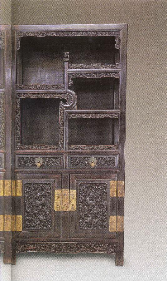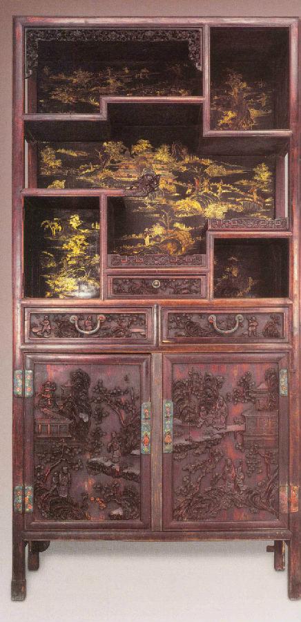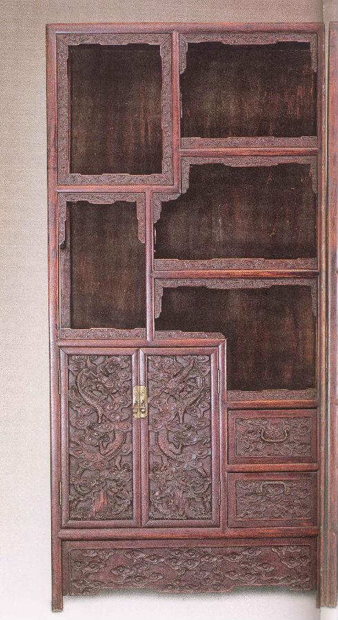 多宝阁是清式家具中很有代表性的一类。明末清初时期李渔所著的《闲情偶寄》一书中,对于橱柜类提出“善治无他,止在多设隔板”和“至于抽替之设,非但必不可少,且自多多益善”。多设隔板以及多设抽屉这两种要求,使得多宝阁这一形制的家具流行起来。其实在明式家具的柜架类中,就有以立木为四足,取横板将空间分为几层,用来陈设、存放物品的家具,称为架格。不过架格每格或完全敞空,或安券口,或安栏杆,但不会出现多宝格中用横、竖板将空间切割成若干高低不等的小格。