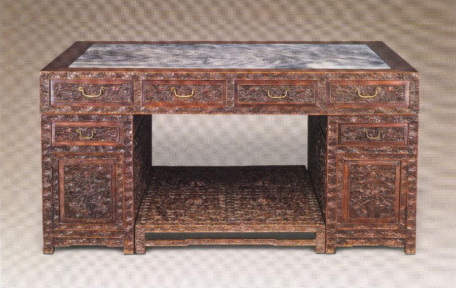 清式家具,以清代雍正、乾隆时期生产的硬木家具最为典型,用料以紫檀、红木为主。清式家具的总体特征是造型厚重,装饰繁缛,精雕细琢,给人以豪华、大气、艳丽的感觉。嘉庆、道光以后,紫檀家具变得少见,多以红木、草花梨木代之,雕刻工艺和制作水平也都不及前朝。