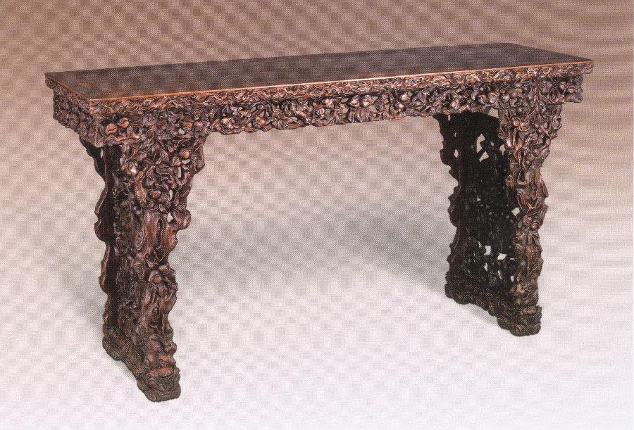 在用料选材上,清式家具推崇色泽深、质地密、纹理细的珍贵硬木,尤以紫檀为首选。在制作上,为了保证外观的色泽和纹理的一致,也为了坚固牢靠,往往采用一木连做的方式,而不用小材料拼接。