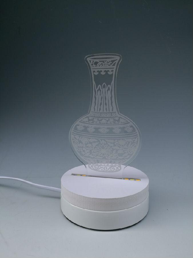 夜灯以亚克力材料雕刻出纹饰图案,使用LED照明,灯光柔和,温馨静美。