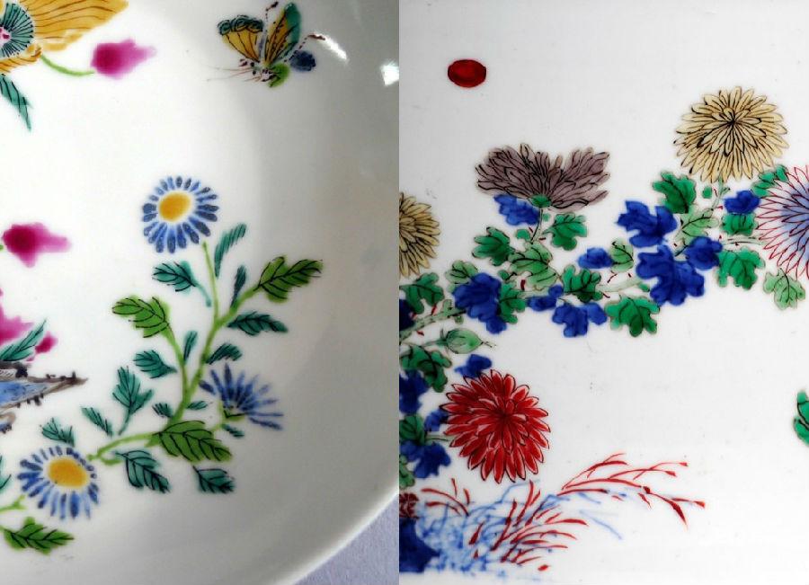 雍正官窑粉彩,花卉颜色丰富,其中尤以胭脂红的颜色最为鲜艳,淡红、紫红相间映衬,渲染层次丰富,颇具立体效果。花蕊部位的色料最厚,从花心至花瓣分不同层次,具有较强的立体感。花蝶图案绘画精细写实,栩栩如生,达到了“花有露珠,蝶有绒毛”的艺术境界。