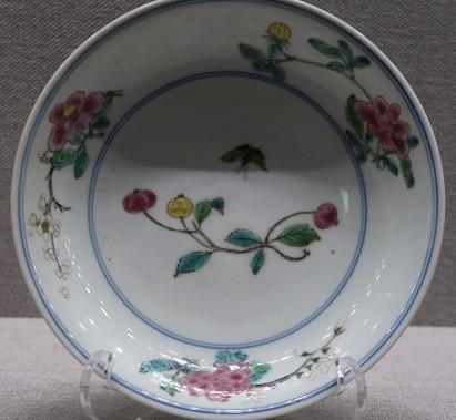 粉彩创烧于康熙晚期。处于初创阶段的粉彩,产量不大,传世品极少。纹饰比较简单,色彩也少,施彩较为粗糙,仅以胭脂红描绘花朵,其他色彩仍沿用五彩的做法。