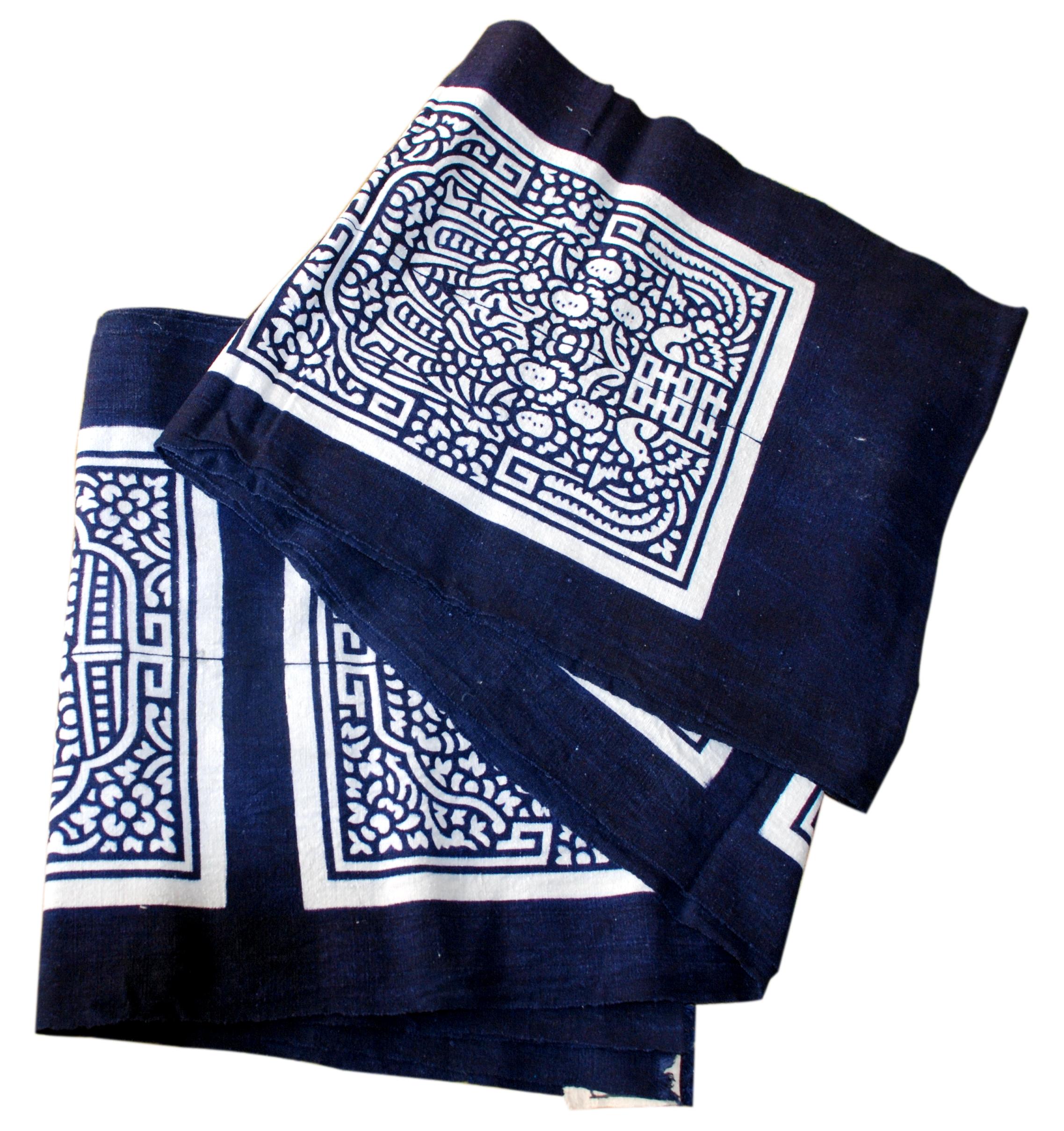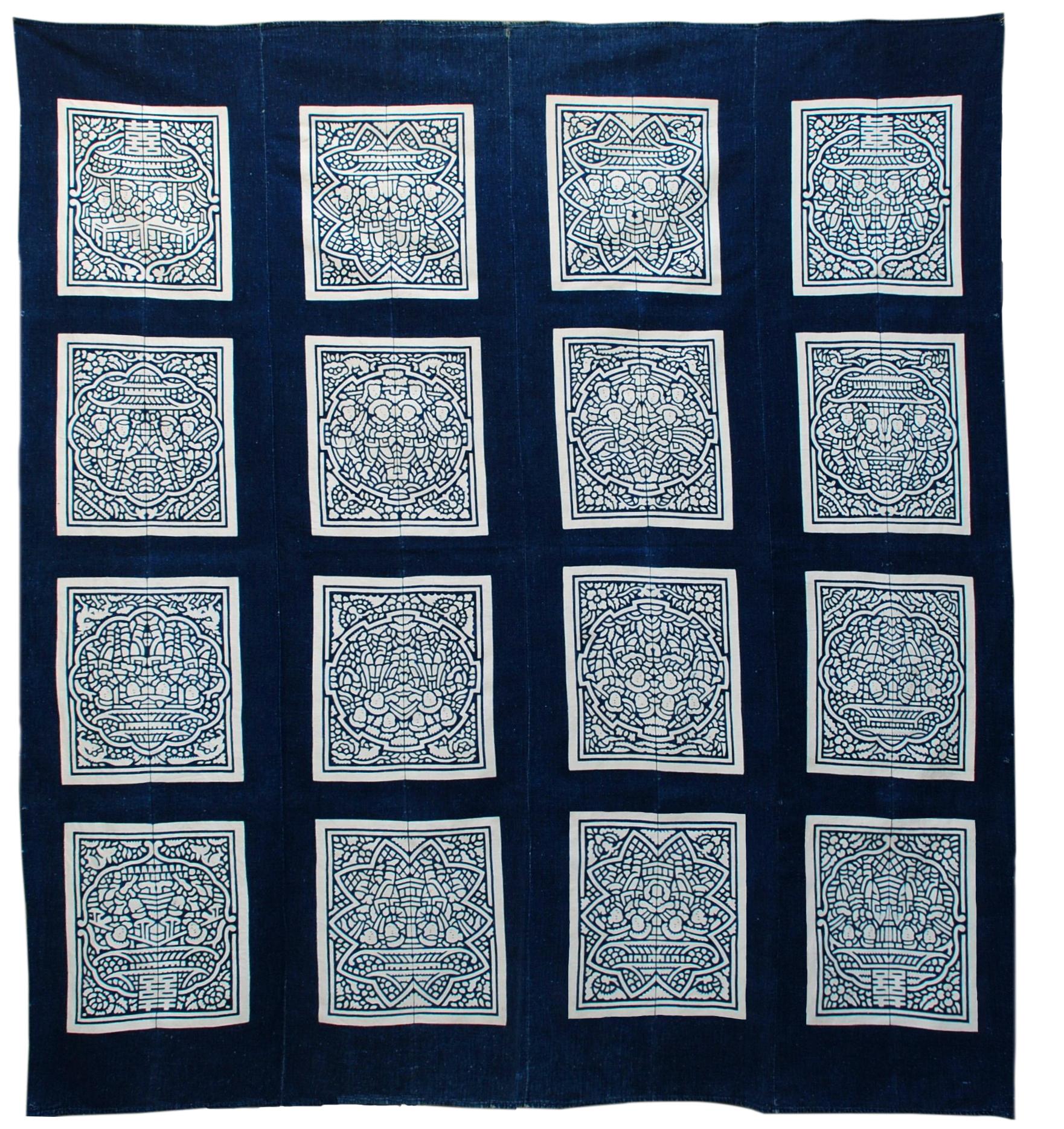 (福禄寿喜纹蓝夹缬棉布被面,清代)