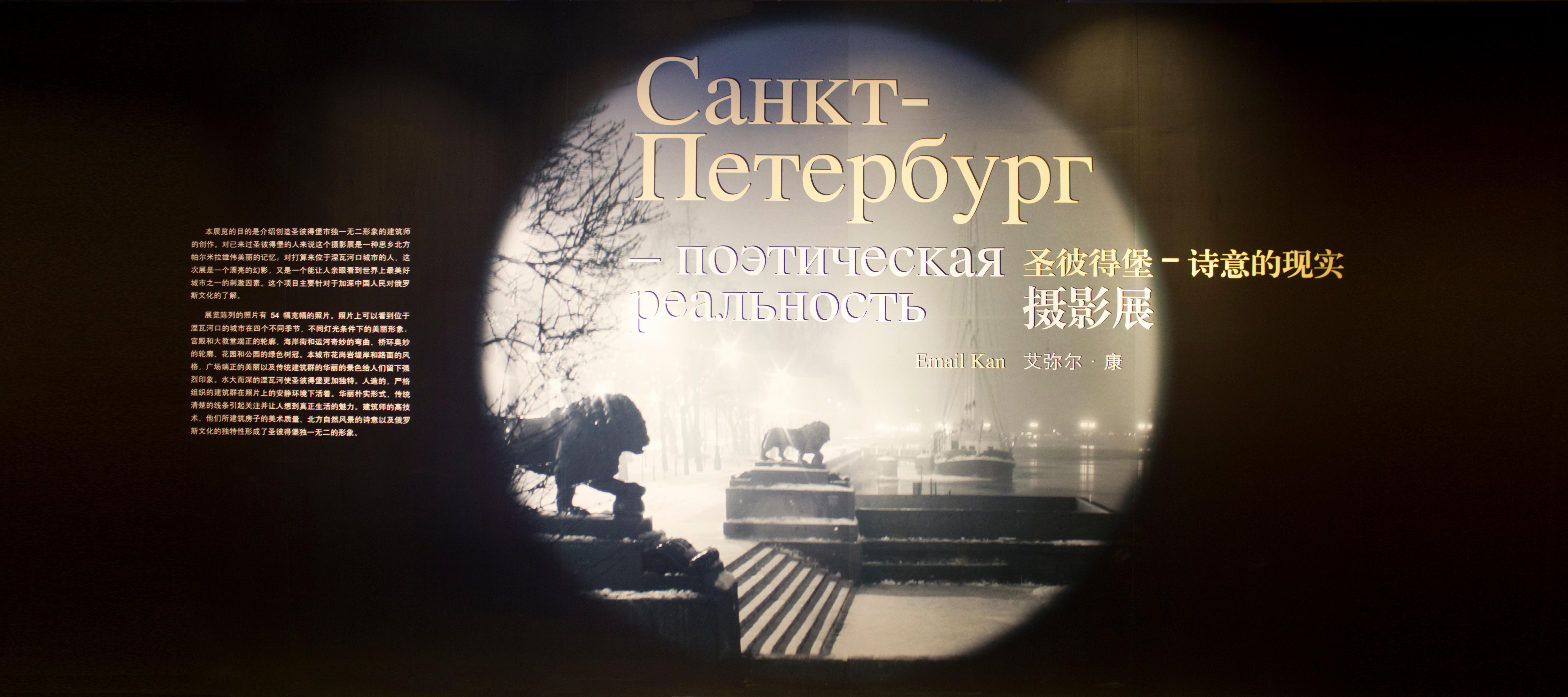 展览陈列的照片有54幅宽幅的照片。照片上可以看到位于涅瓦河口的城市在四个不同季节,不同灯光条件下的美丽形象:宫殿和大教堂端正的轮廓、海岸街和运河奇妙的弯曲、桥环奥妙的轮廓、花园和公园的绿色树冠。本城市花岗岩堤岸和路面的风格,广场端正的美丽以及传统建筑群的华丽的景色给人们留下强烈印象。水大而深的涅瓦河使圣彼得堡更加独特。人造的,严格组织的建筑群在照片上的安静环境下活着。华丽朴实形式,传统清楚的线条引起关注并让人想到真正生活的魅力。建筑师的高技术、他们所建筑房子的美术质量、北方自然风景的诗意以及俄罗斯文化的独特性形成了圣彼得堡独一无二的形象。他们所建筑房子的质量、北方自然风景的诗意以及俄罗斯文化的独特性形成了圣彼得堡独一无二的形象。